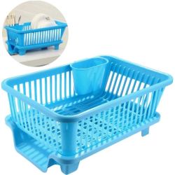 3 in 1 Durable Plastic Kitchen Sink Dish Drying Drainer Rack Holder Basket Organizer with Tray Utensils Tools Cutlery (Blue)