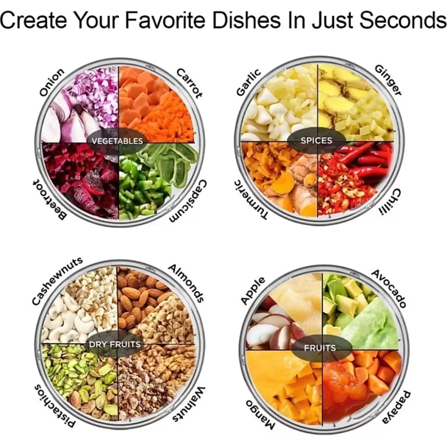 - Perfect for cutting onions, garlic, tomatoes, vegetables, salads, herbs, fruits, boneless meat, nuts and more in seconds