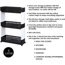 3 Layer Kitchen Storage Organizer Rack with Wheels Storage Basket White & Black